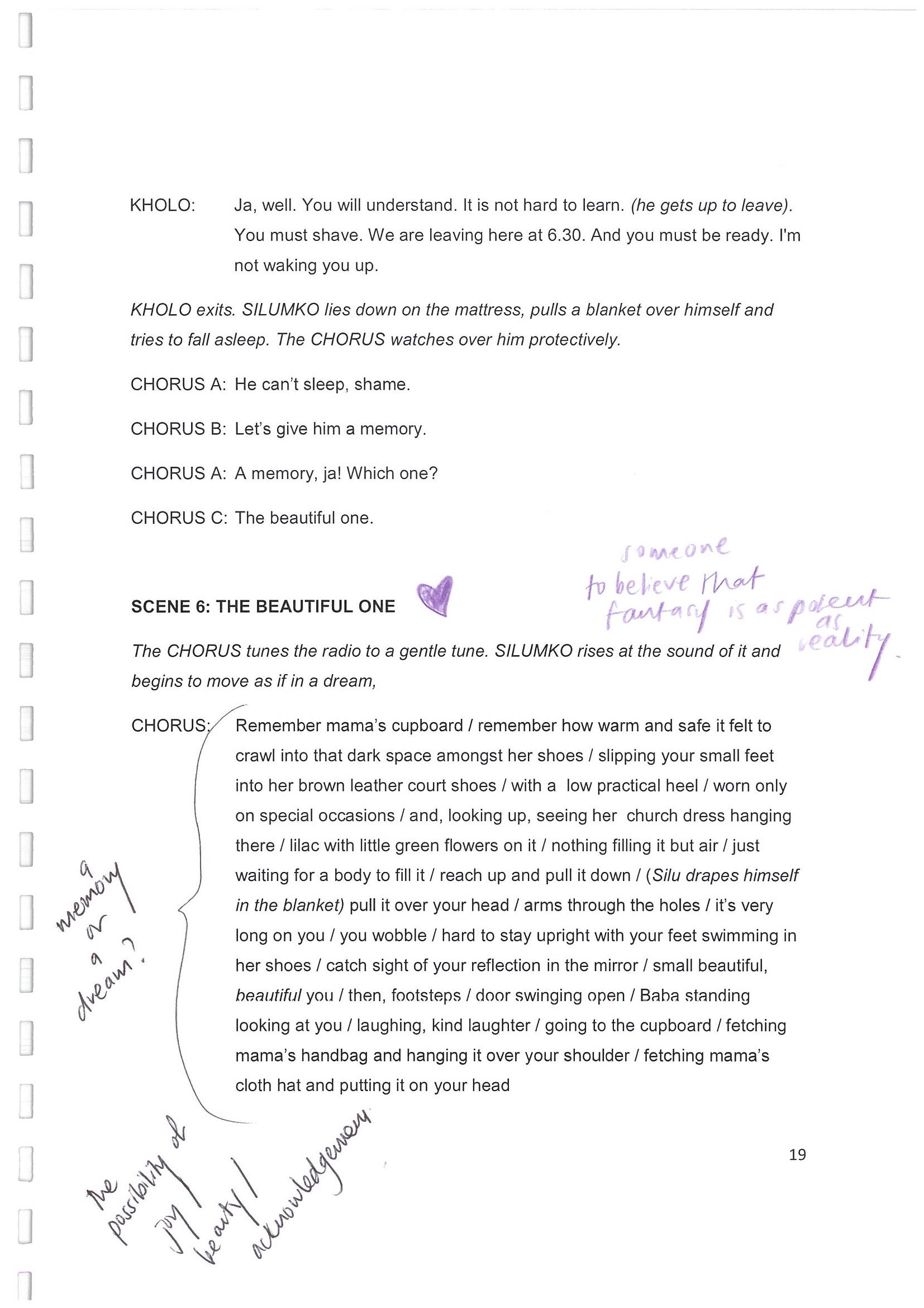 CHORUS: Remember mama’s cupboard / remember how warm and safe it felt to crawl into that dark space amongst her shoes / slipping your small feet into her brown leather court shoes / with a low practical heel / worn only on special occasions / and, looking up, seeing her church dress hanging there / lilac with little green flowers on it / nothing filling it but air / just waiting for a body to fill it / reach up and pull it down / (Silu drapes himself in the blanket) pull it over your head / arms through the holes / it’s very long on you / you wobble / hard to stay upright with your feet swimming in her shoes / catch sight of your reflection in the mirror / small beautiful, beautiful you / then, footsteps / door swinging open / Baba standing looking at you / laughing, kind laughter / going to the cupboard / fetching mama’s handbag and hanging it over your shoulder / fetching mama’s cloth hat and putting it on your head